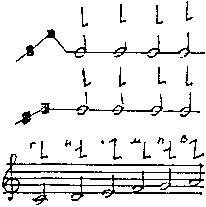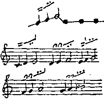 Тот же речитативный мотив, в котором вершина находится на две ступени выше речитатива. Она подтягивает наверх последующую тонему, становящуюся связкой между речитативными повторами и вершиной (принцип подвешенной на разной высоте нитки с бусинками)...и др. |