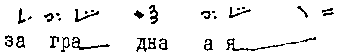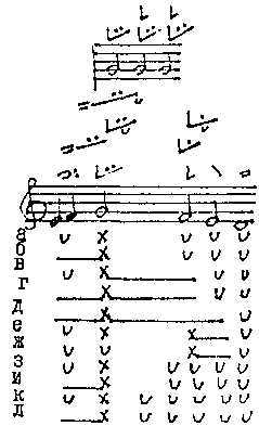 Кадансовый мотив восходяще-нисходящего типа — КУЛИ'ЗМА СРЕ'ДНЯЯ, КУЛИ'ЗМА СКАМЕ'ЙНАЯ, КУЛИ'ЗМА ВЫСО'КАЯ. Шеститонем-ный восъмиморный мотив... Пятиэлементное просодическое звено: две простые просодемы (I 3.2, I 2.1а), акцентно сложная двутонемная просодема и две простые просодемы. Озвучивает слоговую группу того же ритмического склада (а)... Основная знаковая группа из пяти знамен: голубчик борзый (I 3.2), палка(I 2.1а), условные «тайнозамкненные» знаки полкулизма и статья простая закрытая, знамя статья простая (I 3.3)... |