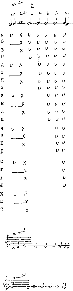 Кадансовый мотив восходяще-нисходящего типа — ПРИГЛАСКА, ПРИГЛАСНАЯ, ТАГА'НЕЦ, толча'нец, ПОСО'ВЕЦ, ЗАГРА'ДНАЯ, ЗАГЛАВНАЯ.5 Пятитонемный, шестиморный: подступ к вершине — краткая двузвучная восходящая тонема, КДВ (I 3.2), вершина — краткая однозвучная тонема, КО (I 2.1), спад — краткая однозвучная тонема, КО, спад — также краткая однозвучная тонема, КО, низкий финалис — долгая однозвучная тонема, ДО (1 3.3). Тонемы высотно органи<501>зованы мелодической волной. Устоем служит тонема финалис, с ней соизмерима вершина, расстояние между которой и финалисом заполняется двумя тонемами спадами, начальная тонема подступ прилегает к тонеме вершине. Мотив имеет постоянную высоту во втором, четвертом, шестом и восьмом гласе (в таблице указано римскими цифрами). Пятиэлементное просодическое звено из простых просодем, вторая из них акцентная (в кадансовых мотивах конечный элемент может быть как акцентным, так и неакцентным). Озвучивает слоговую группу того же ритмического склада (а). Группировкой тонем в сложные просодемы образуются варианты, которыми исполняются тексты без предакцентного слога (б,г,д,и,л) или с меньшим числом послеакцентных слогов (в,г,д,е,ж). Мотив редко принимает текст с бо'льшим числом послеакцентных слогов, и в этих случаях с повторением вершины (редко употребляемый прием) увеличивается число послеакцентных просодем (з,и,к,л)...6 Знаковая группа из пяти знамен: голубчик борзый (I 3.2), крюк светлый (I 2.1), стопица, палка, статья простая.7 При группировке тонем в сложные просодемы используются соответствующие сложные знамена: стрела светлая (1А 1.1), крюк светлый с подчашием (1А 2.1), крюк мрачный с подчашием, стрела светлая с подверткой (трехтонемное сочетание подступа, вершины и спада). Повторение вершины записывается тем же знаменем крюк светлый или знаменем стопица, что не оправдано, так как она есть знак повторов... |